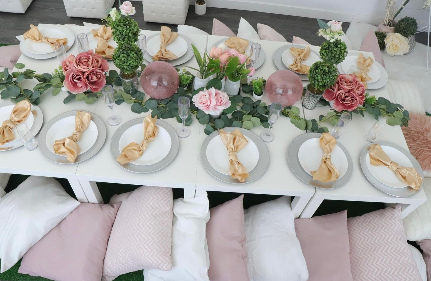 $150 flat rate in studio for 12 guests. 6 color schemes available. Black or white tables. Larger package and off-site pricing varies.
