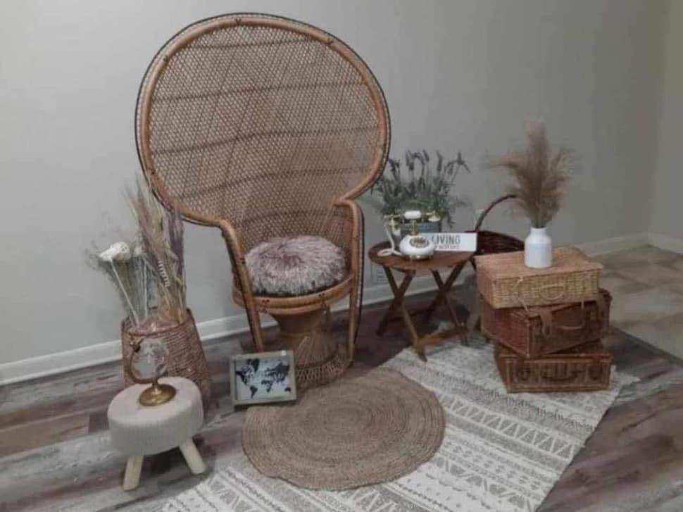 Vintage Peacock Chairs. $60 flat rate in studio. Choose from two styles. Additional vintage screens and accents available at a cost. Off-site pricing varies.